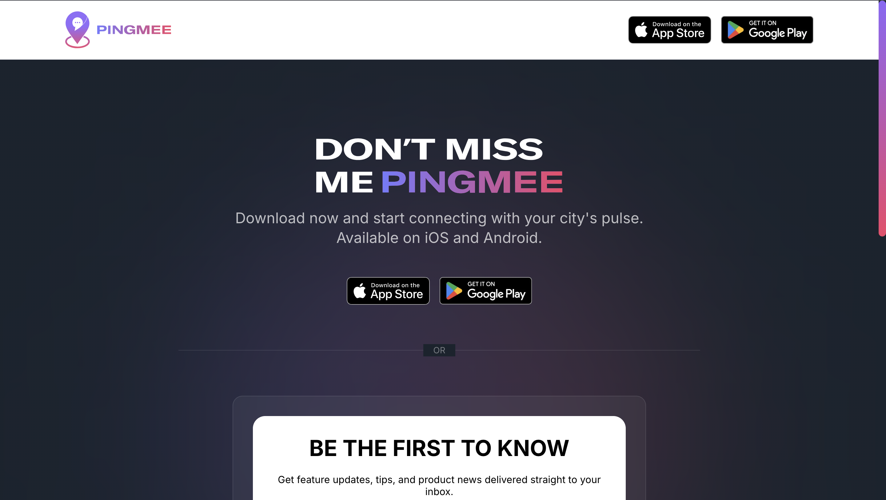Pingmee is a social media platform that allows users to meet and connect with people nearby. I developed their landing page which allows users to sign up for early access.